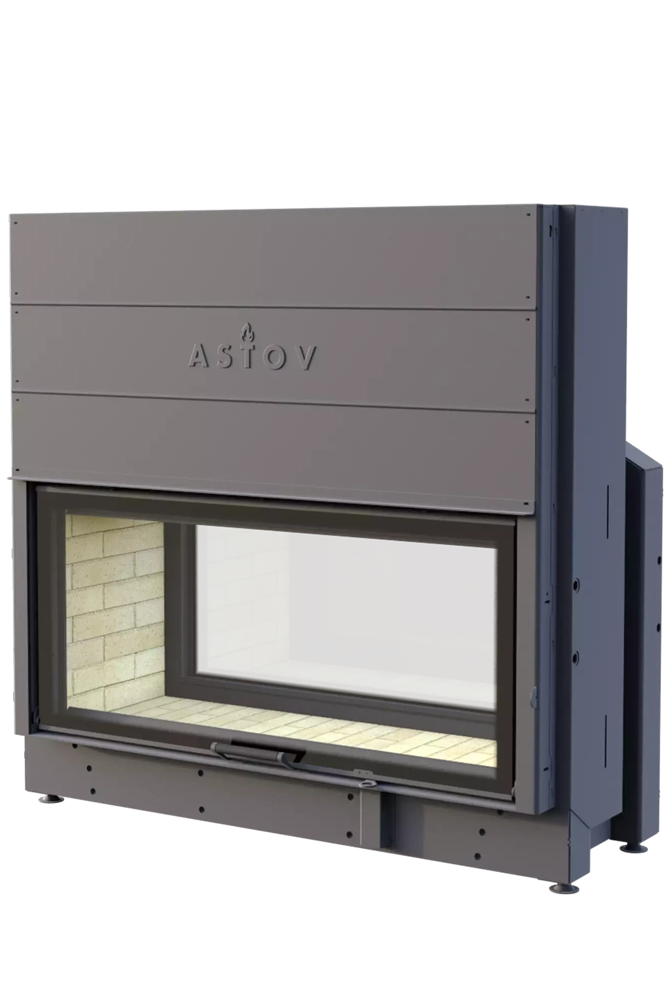 Две дверцы с прямым стеклом. Пространная, сквозная модель, великолепно вписывается в межкомнатные перегородки, для созерцания огня как из гостиной, так и из спальни или кабинета, служит отличной основой, для создания центрального (островного) камина.