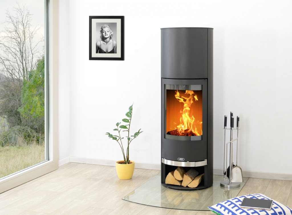 Печь Alkmar I выполнена в минималистическом стиле, имеет цилиндрическую форму, можно установить, как в центре помещения, так и в углу или около стены. Стальной корпус окрашен в черный матовый цвет, внизу есть ниша для дров, серебристая ручка, для открытия дверцы, с большим закругленным стеклом, расположена под топочной камерой. Внутри топка футерована вермикулитом, имеет вторичный дожег. Дымоход можно подключить сверху или сзади печи, есть возможность подключения воздуха на горение с улицы или смежного помещения. Дополнительно в верхней части печи можно установить тепло-накопительные элементы, которые позволят получать тепло даже после окончания горения.
