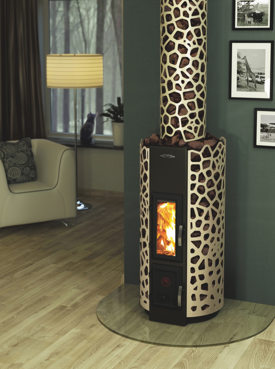 Камни долго держат тепло, хорошо экранируют сильное тепловое излучение от металлической топки и прекрасно нагревают воздух помещения естественной воздушной конвекцией через сетчатый кожух.