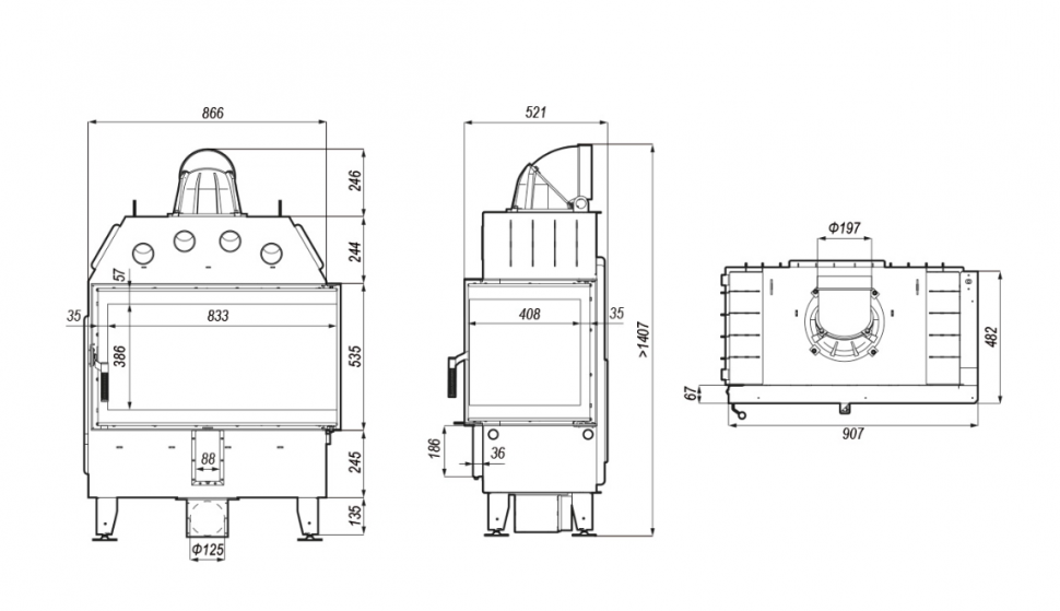 Если требуется большая топка с угловым стеклом, то обратите внимание на продукцию компании Defro (Польша). Топка INTRA ME BL номинальной мощностью в 13 кВт, разгоняется легко от 5 до 15,6 кВт в пиковом значении. Обратите внимание – диаметр выхода дымосборника –200 мм, что облегчает адаптацию подключения к дымоходам ограниченного сечения. Раструб дымосборника чугунный поворотный. Длина поленьев при горизонтальной укладке 700 см. Для лучшего отвода тепла на куполе предусмотрены теплоотводящие ребра и четыре теплоотводных канала внутри дымосборника, обеспечивающий эффективный съём тепла для конвекционного обогрева помещения. Опционально можно заказать следующее оборудование: